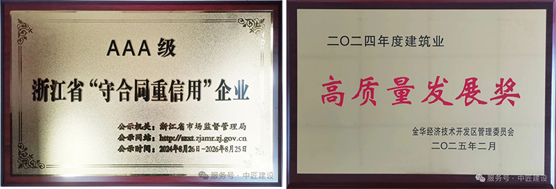 公司憑借卓越的工程質量保證能力和服務水平,經過多年潛心經營,近幾年獲得“浙江省建筑業先進企業”、“第二批浙江省科技型中小企業”、“金華市建筑業骨干企業”、“金華經濟技術開發區龍頭企業”、“金華經濟技術開發區政府質量獎”、“金華市建筑業行業先進企業”、“金華市市政行業先進單位”、“金華市園林綠化行業先進單位、誠信單位”、浙江省AAA級“守合同重信用”企業等榮譽稱號,為公司樹立了建筑行業的良好形象,更為公司打造優質服務品牌插上了騰飛的雙翅。